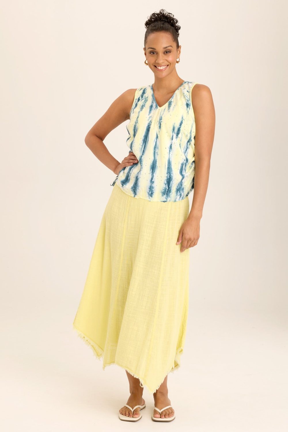 A pretty tank with unusual details. Ileana features a cinchable side seam with brass stopper and a contrast back panel.