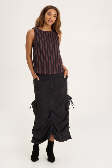 $93.00A fun new twist on stripe, Gatlin Tank features a stripe front and a contrasting jersey back with side hem splits and a bra covering cut. Indigo Multi Stripe: 100% Cotton. Indigo Jersey Contrast: 100% Cotton. Center Front: ~20.25″. Center Back: ~21″. Color Description: Robust burnt orange stripes on a…