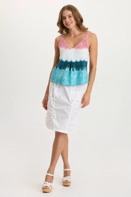 $112.00A pretty tank with unusual details. Ileana features a cinchable side seam with brass stopper and a contrast back panel. Taissa Twill: 70/30 Rayon/Tencel. Center Front: ~15.75″ Center Back: ~23″ Color Description: Splatter and Striped blue, yellow and white tie dye Preshrunk Machine washable Imported MODEL August is wearing size…